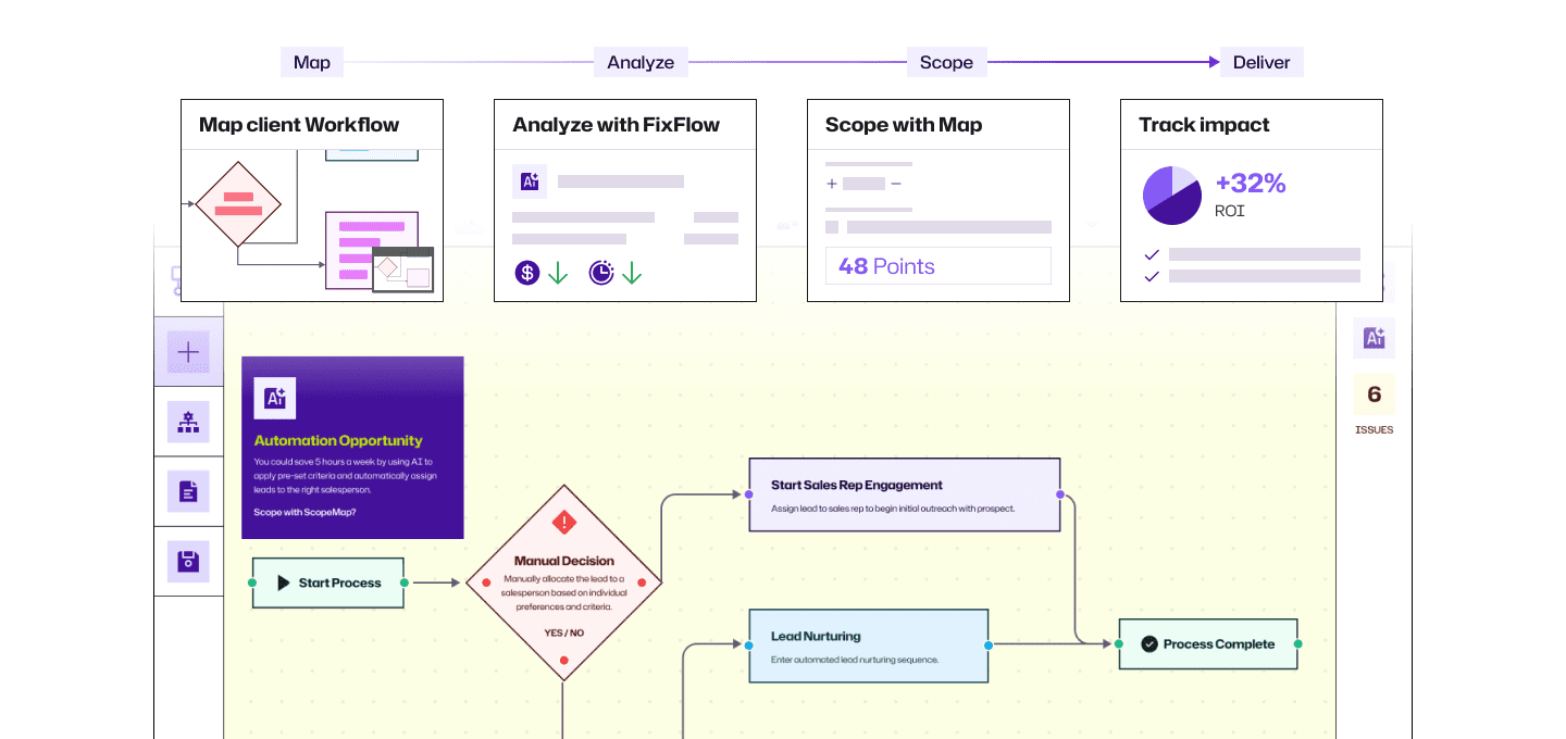 FixFlow does more than diagnose. It equips you with solutions ranging from process changes to integrations and training, so you walk in with fixes that clients can act on immediately.